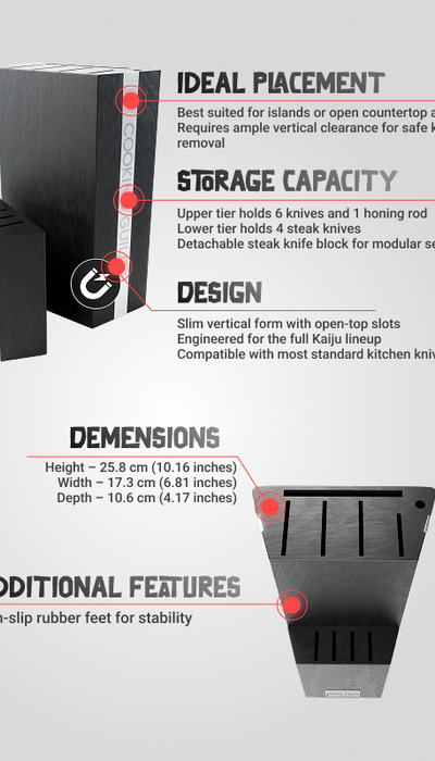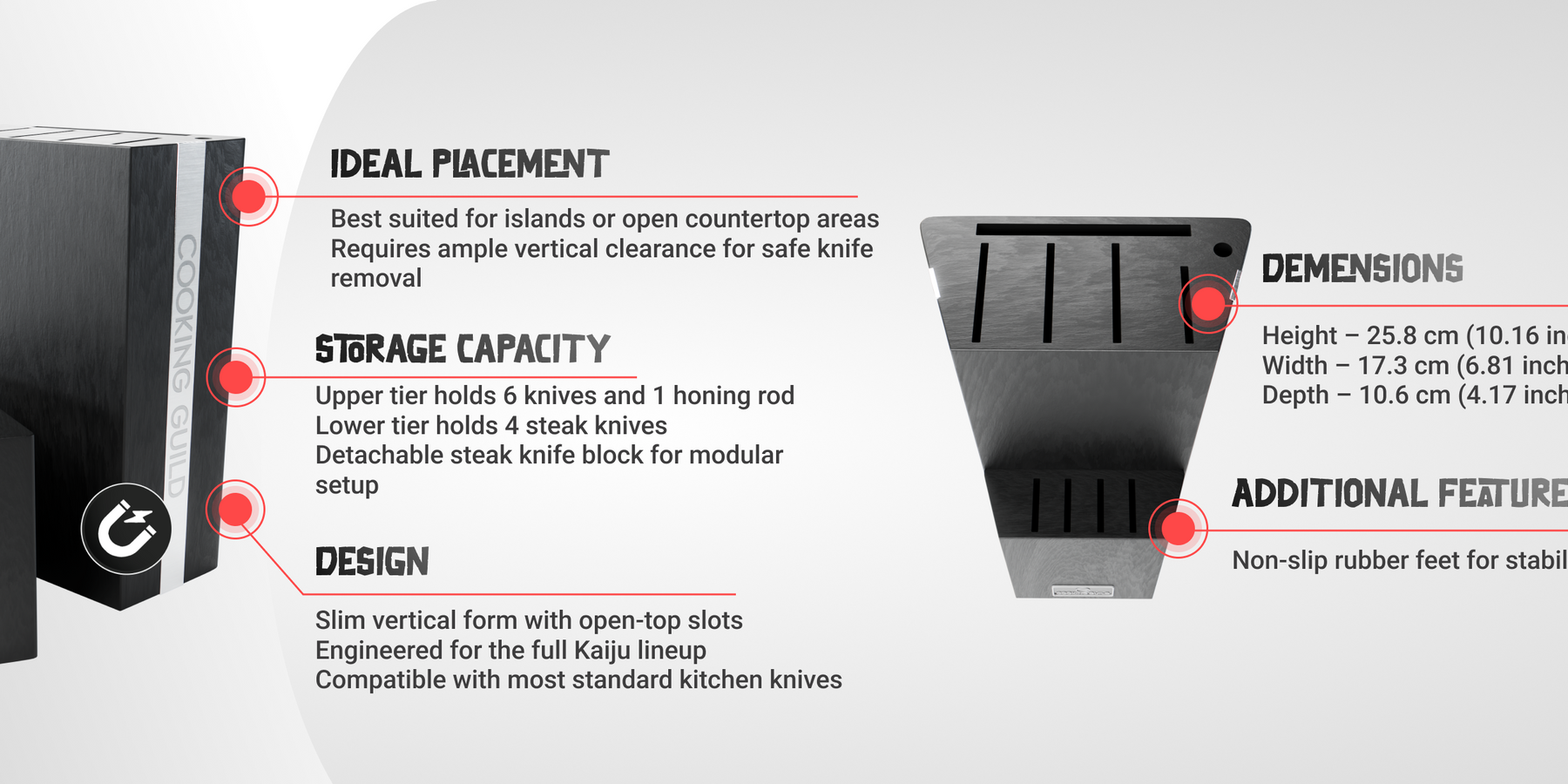 • Lower Tier: A fully detachable steak knife block that houses 4x Kaiju steak knives, seamlessly integrated when connected