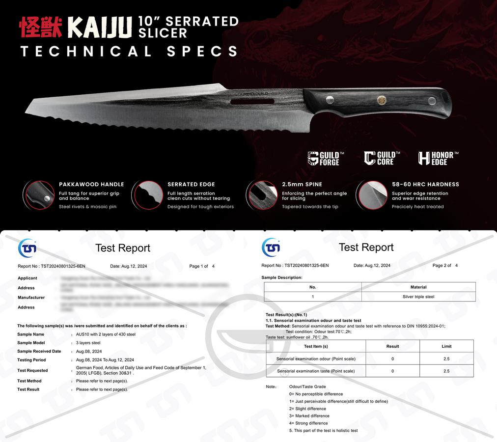 Die rustikale Schmiedeoberfläche erhöht die Haltbarkeit, indem sie die Reibung verringert und verhindert, dass Lebensmittel an der Klinge kleben bleiben. Außerdem verleiht sie jedem Messer eine einzigartige, kampferprobte Ästhetik – perfekt passend zur rohen Kraft und Präzision der Kaiju-Serie .