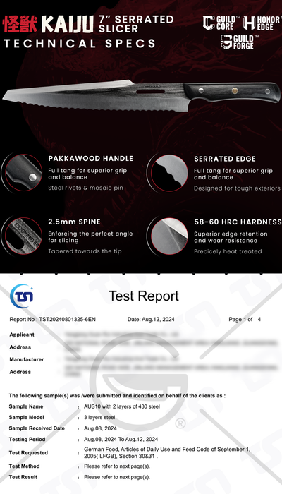 Der Kern aus 1,5 % Kohlenstoff verleiht den Kaiju-Messern eine außergewöhnlich harte und rasiermesserscharfe Schneide , wodurch sie sich ideal für präzises Schneiden eignen. Dies bedeutet jedoch auch, dass sie bei unsachgemäßer Verwendung anfälliger für Absplitterungen sind. Diese Messer sind für Hochleistungsschneiden konzipiert – vermeiden Sie die Verwendung auf Knochen, gefrorenen Lebensmitteln oder harten Oberflächen, um Schäden zu vermeiden.